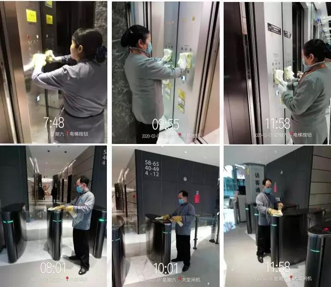 、17:20-18:00)安排保洁员定岗,使用德国进口的德倍洗消毒清洁剂频繁消毒。越秀金融大厦使用香港邓氏万能消毒清洁剂进行清洁消毒,频次保持每2小时一次,上下班高峰期为每1小时一次。同时加强各出入口通道、手扶梯、洗手间等区域的消毒频次。