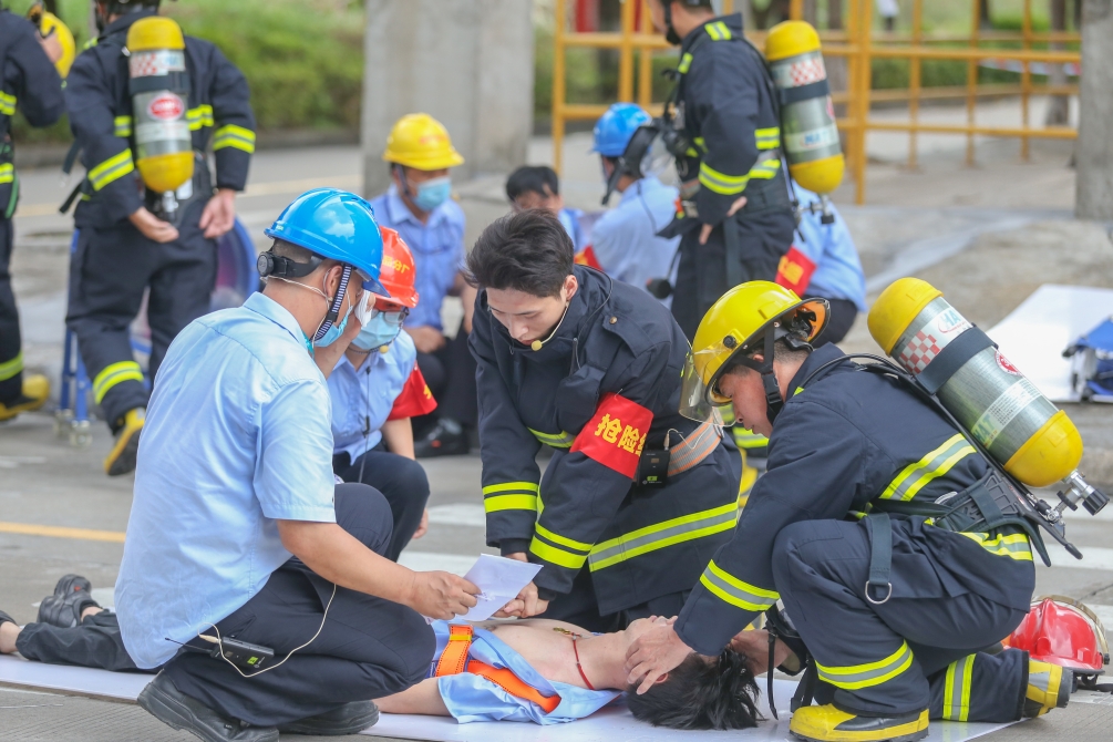 随后,演练模拟了新产品分厂在进行浆塔搅拌器检修作业时,因作业人员不规范作业造成在作业塔内中毒窒息倒地的有限空间作业事故场景,公司立即按应急预案要求成立现场指挥部,组织技术组、抢险组、警戒组、救护组,通过信息逐级报送、应急联动、应急响应、群众疏散安置、预警、现场指挥等环节开展事故前期处置,应急管理部门、120急救中心医疗组与公司各应急救援小组快速联动,人员陆续被救出并送往临时医疗点实施抢救,恢复生命体征后被送往医院进一步救治,达到了“磨合应急联动机制,锤炼应急救援队伍,检验应急预案”的目的。