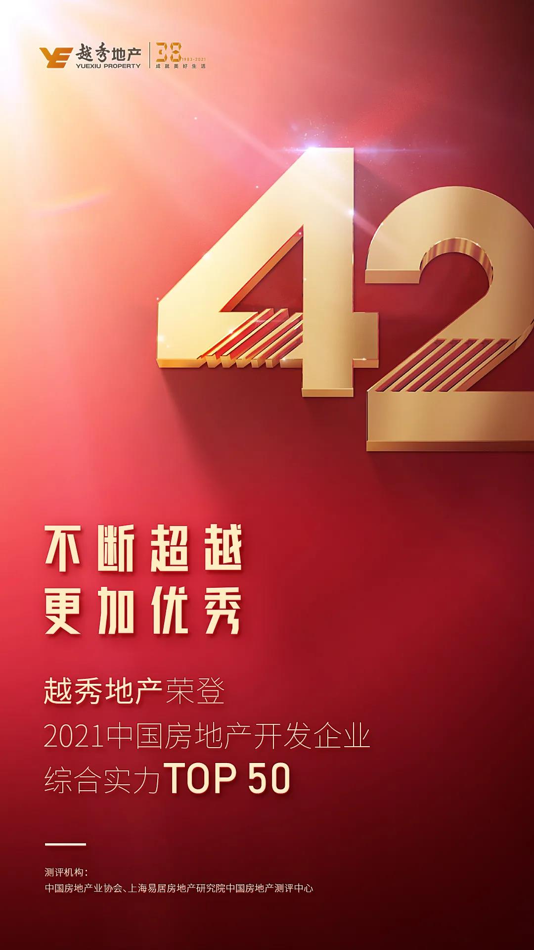 3月16日,由中国房地产业协会、上海易居房地产研究院中国房地产测评中心共同推出的“2021中国房地产开发企业500强测评成果”正式发布。越秀地产由于企业战略稳健、市场表现出色、综合实力凸显,在“2021中国房地产开发企业综合实力TOP50”中排名第42位。