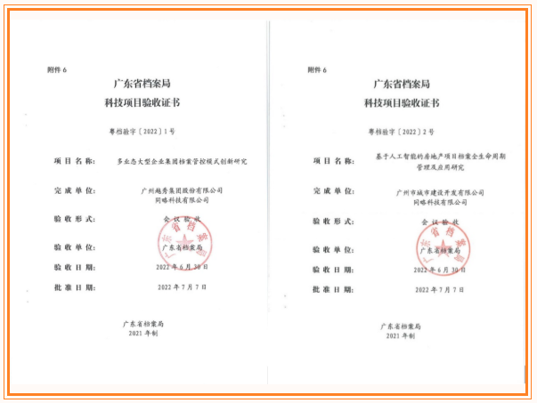 近日,集团总部《多业态大型企业集团档案管控模式创新研究》项目和越秀地产《基于人工智能的房地产项目档案全生命周期管理及应用研究》项目通过省档案科技项目验收,两个项目获得专家组充分肯定,成为省档案局科技项目管理办法修订后首批通过科技验收的项目。